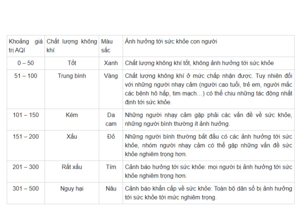 Chỉ số AQI được tính theo thang điểm (06 khoảng giá trị AQI) tương ứng với biểu tượng và các màu sắc để cảnh báo chất lượng không khí và mức độ ảnh hưởng tới sức khỏe con người, cụ thể như sau:
