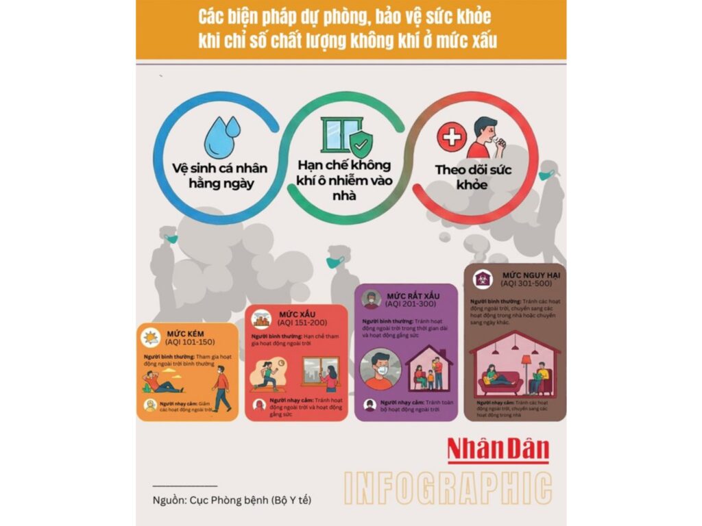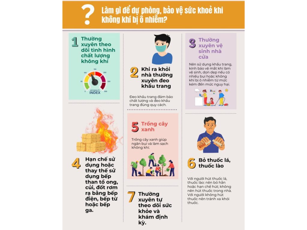 Về các biện pháp dự phòng, bảo vệ sức khỏe chung, Cục Phòng bệnh hướng dẫn người dân thường xuyên theo dõi tình hình chất lượng không khí trên trang thông tin điện tử của Bộ Nông nghiệp và Môi trường, Sở Nông nghiệp và Môi trường các tỉnh, thành phố để thực hiện các biện pháp dự phòng, bảo vệ sức khỏe phù hợp;